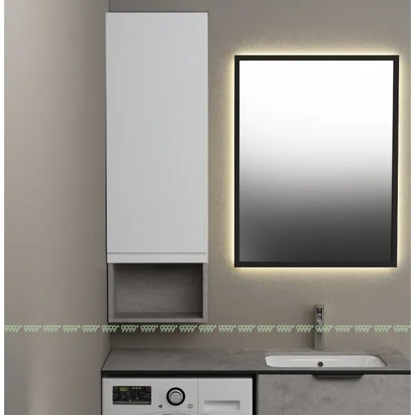 Корпус и фасад - Фасады выполнены из высококачественного крашеного МДФ Egger (Австрия), толщина-19 мм, цвет белый, матовый, фрезерованная ручка (или накладная на выбор). Боковиные стенки, корпус , полки шкафчика выполняются из высококачественного ЛДСП Egger (Австрия), цвет бетон чикаго светло-серый.