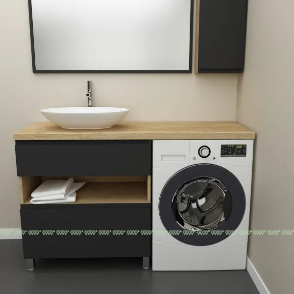 Корпус и фасад - Фасады выполнены из высококачественного крашеного МДФ Egger (Австрия), толщина-19 мм, цвет черный матовый, интегрированная ручка. Боковиные стенки, корпус , полки шкафчика выполняются из высококачественного ЛДСП Egger (Австрия), цвет дуб