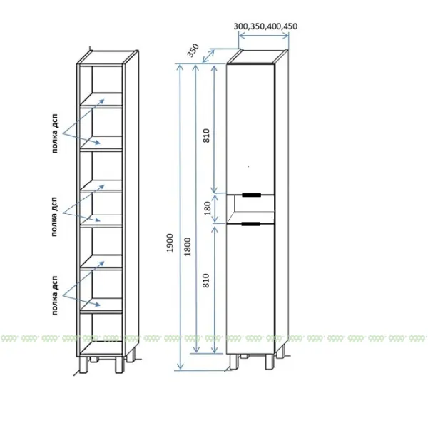 функционал: напольный пенал на 4 ножках , 6 полок (одна по середине открытая), накладные ручки-профиль черного цвета (по желанию можно заменить на хром).
