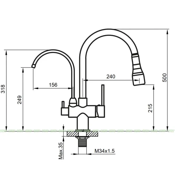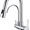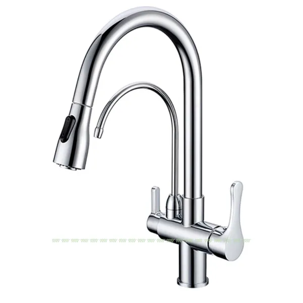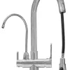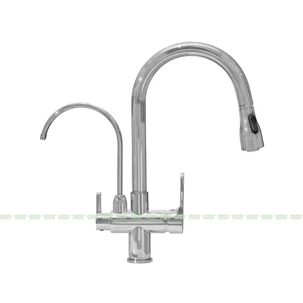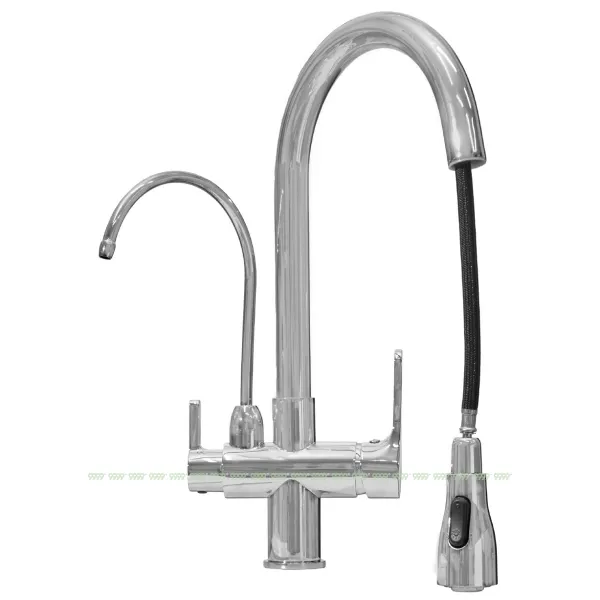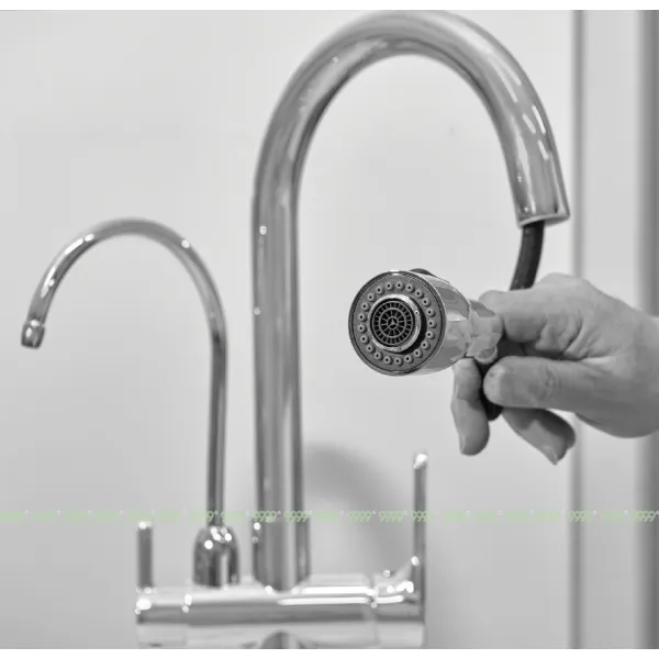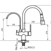 Высокий поворотный излив (поворот на 360°) и упрощает доступ к раковине. Разбрызгиватель ABS имеет два режима: распыление и потоковый, переключение осуществляется нажатием кнопки на носике.