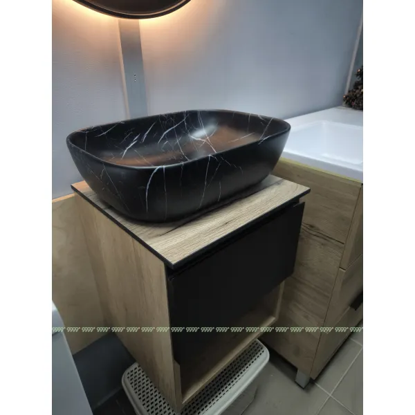 Мебель для ванной: тумбы, пеналы, шкафчики и т.д поставляются в СОБРАННОМ ВИДЕ (кроме накладных ручек и ножек, если таковые есть в модели, они прикручиваются самостоятельно), столешницы под врезной или накладной умывальник изготавливаются БЕЗ ВЫРЕЗОВ под умывальник и смеситель (все вырезы производятся самостоятельно после монтажа столешницы на опоры (тумбу, кронштейны, уголки и т.д.) или оплачиваются дополнительно, но только после согласования)