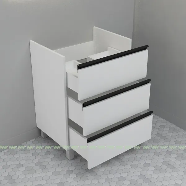 функционал: напольная тумба с регулируемыми ножками, 3 выдвижных ящика с плавным ходом и закрыванием (доводчики нижнего монтажа - Boyard)