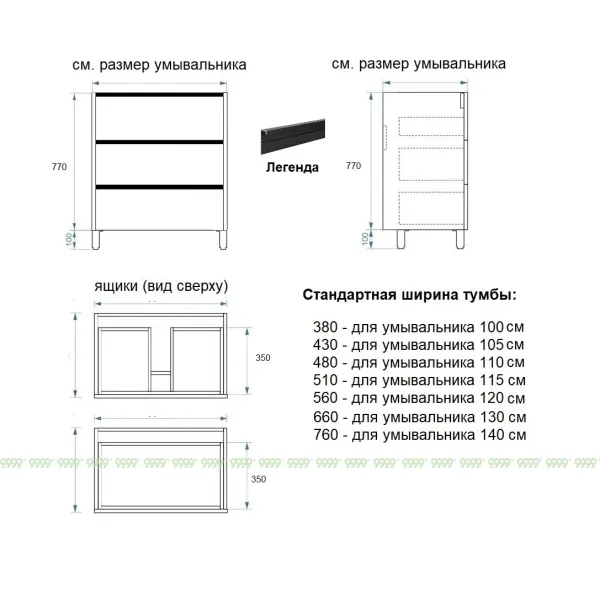 Мебель для ванной: тумбы, пеналы, шкафчики и т.д поставляются в СОБРАННОМ ВИДЕ (кроме накладных ручек и ножек, если таковые есть в модели, они прикручиваются самостоятельно), столешницы под врезной или накладной умывальник изготавливаются БЕЗ ВЫРЕЗОВ под умывальник и смеситель (все вырезы производятся самостоятельно после монтажа столешницы на опоры (тумбу, кронштейны, уголки и т.д.) или оплачиваются дополнительно, но только после согласования)