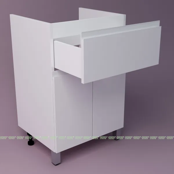 Функционал: напольная тумба, 2 дверцы и 1 ящик, доводчики скрытого монтажа, 4 регулируемые ножки, фрезерованная или накладная ручка (на выбор).