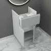 Снимите все выдвижные ящики из тумбы: во-первых, для безопасности, чтобы случайно их не повредить, а во-вторых, дать беспрепятственный доступ для монтажа к стене и к коммуникациям сзади для подключения смесителя и установки сифона. Прикрутите ножки в напольную тумбу.
