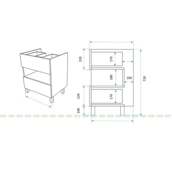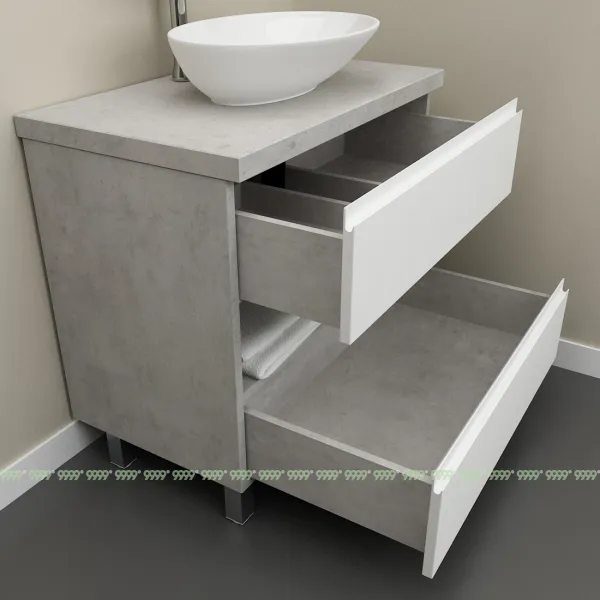 Функционал: напольная тумба, 2 выдвижных ящика с плавным ходом и закрыванием (доводчики нижнего монтажа : Boyard), открытая полка.