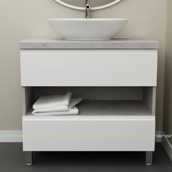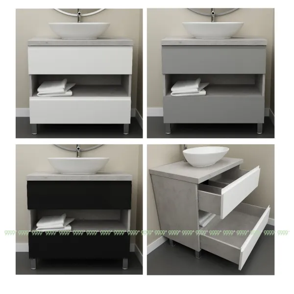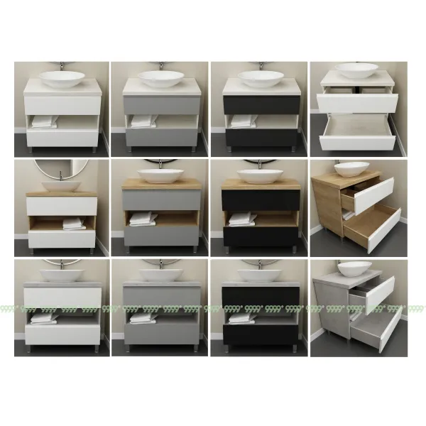 Мебель для ванной: тумбы, пеналы, шкафчики и т.д поставляются в СОБРАННОМ ВИДЕ (кроме накладных ручек и ножек, если таковые есть в модели, они прикручиваются самостоятельно), столешницы под врезной или накладной умывальник изготавливаются БЕЗ ВЫРЕЗОВ под умывальник и смеситель (все вырезы производятся самостоятельно после монтажа столешницы на опоры (тумбу, кронштейны, уголки и т.д.) или оплачиваются дополнительно, но только после согласования)