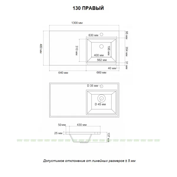 При производстве изделий из литьевого мрамора допустимое отклонение линейных размеров -+ 5мм.