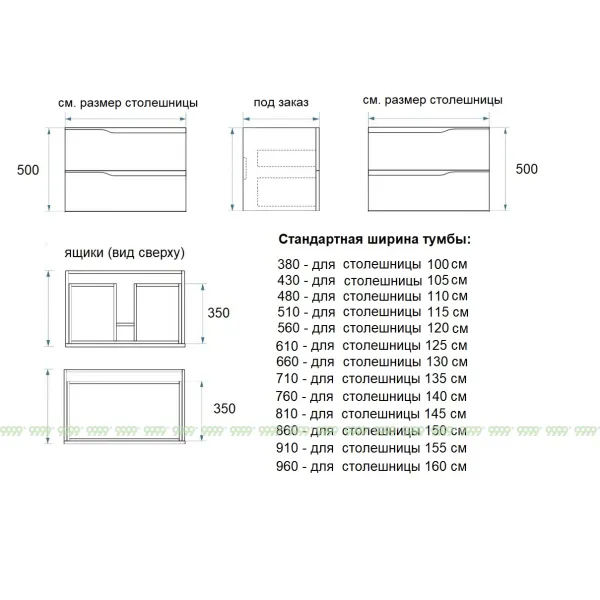 Мебель для ванной: тумбы, пеналы, шкафчики и т.д поставляются в СОБРАННОМ ВИДЕ (кроме накладных ручек и ножек, если таковые есть в модели, они прикручиваются самостоятельно), столешницы под врезной или накладной умывальник изготавливаются БЕЗ ВЫРЕЗОВ под умывальник и смеситель (все вырезы производятся самостоятельно после монтажа столешницы на опоры (тумбу, кронштейны, уголки и т.д.) или оплачиваются дополнительно, но только после согласования)