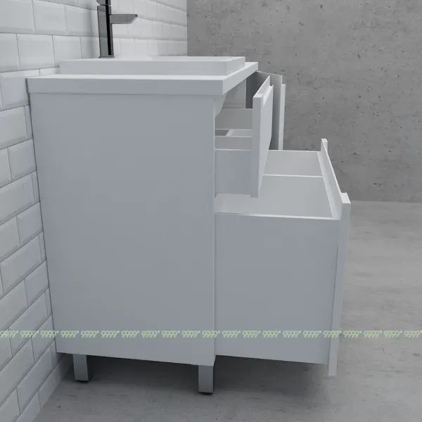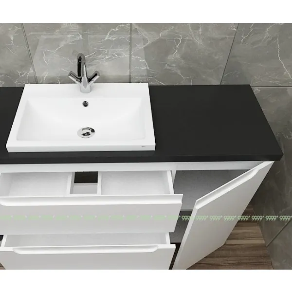 функционал: напольная тумба, 2 выдвижных ящика (нижний ящик можно использовать как корзину для белья), 1 дверца с плавным ходом и закрыванием (доводчики нижнего монтажа - Boyard), 1 полка.