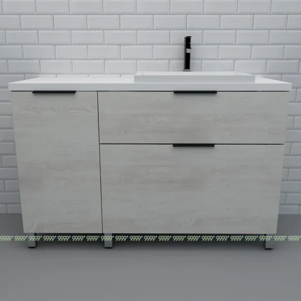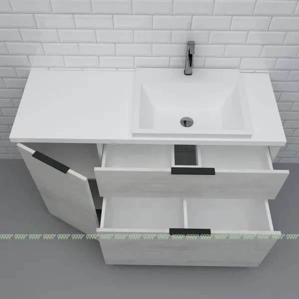 функционал: напольная тумба, 2 выдвижных ящика (нижний ящик можно использовать как корзину для белья), 1 дверца с плавным ходом и закрыванием (доводчики нижнего монтажа - Boyard), 1 полка.