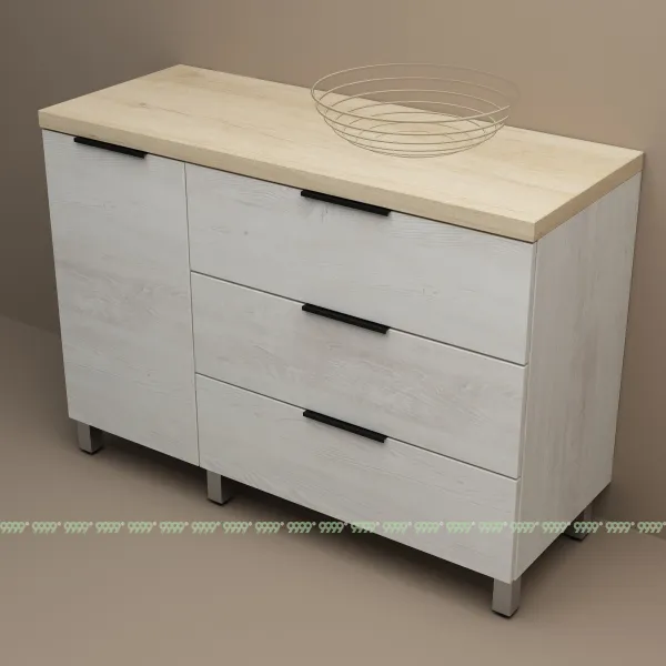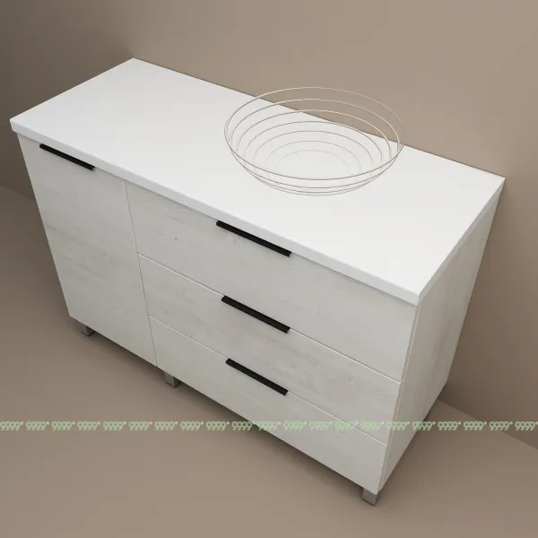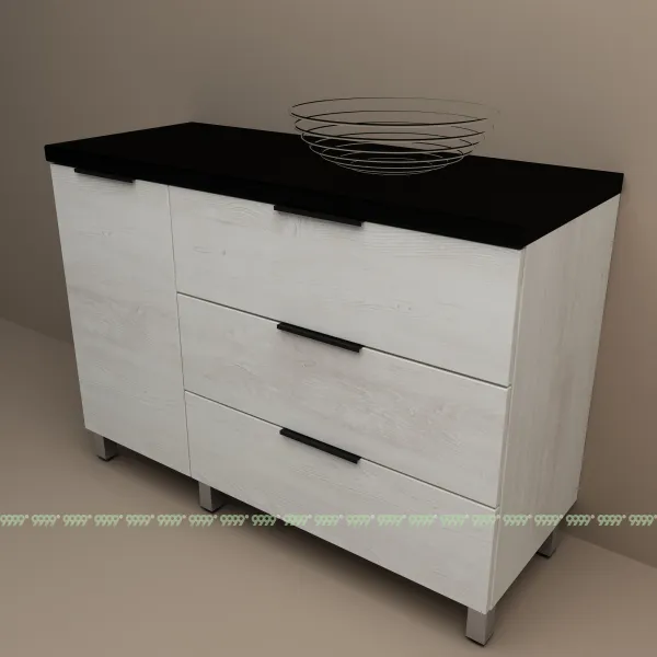 функционал: напольная тумба, 3 выдвижных ящика и 1 дверца с плавным ходом и закрыванием (доводчики нижнего монтажа - Boyard), 1 полка.