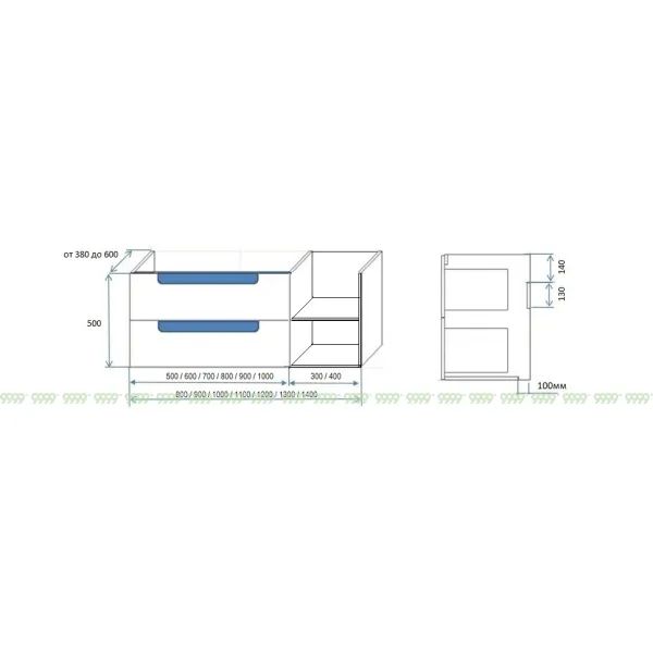 функционал: подвесная тумба, 2 выдвижных ящика (доводчики нижнего монтажа - Boyard), 2 открытые полки полки.