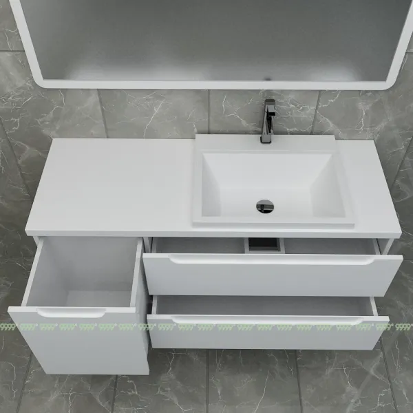 функционал: подвесная тумба, 3 выдвижных ящика с плавным ходом и закрыванием (доводчики нижнего монтажа - Boyard), боковой ящик можно использовать как корзина для белья.