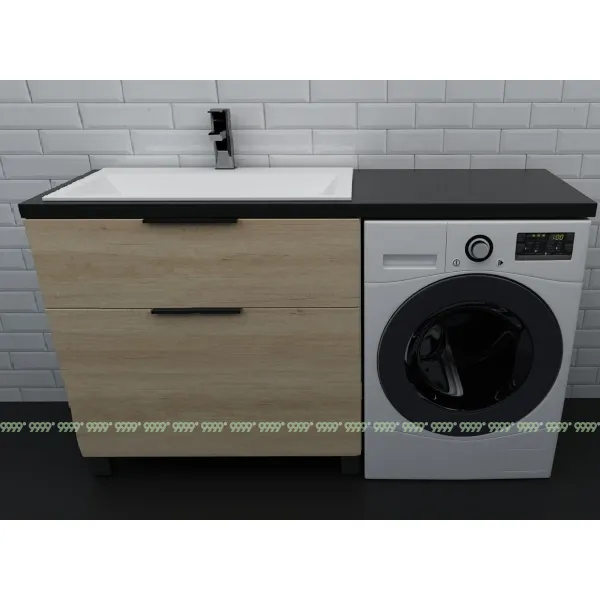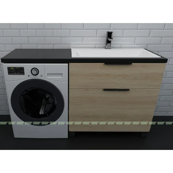 Посередине умывальника можно (но не обязательно) добавить дополнительную точку опоры – брусок (он входит в комплект с умывальником Люкс) или любую другую подложку (на Ваше усмотрение), которые ложатся на вторую стенку тумбы (со стороны стиральной машины) и служат добором высоты от тумбы до умывальника. Это облегчит установку, приподнимет край и зафиксирует середину умывальника-столешницы на тумбе.