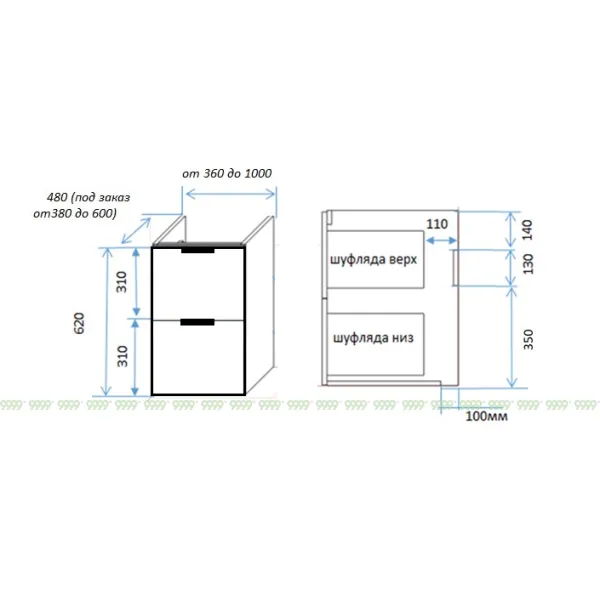 Функционал: подвесная тумба, 2 выдвижных ящика с плавным ходом и закрыванием (доводчики нижнего монтажа - Boyard).