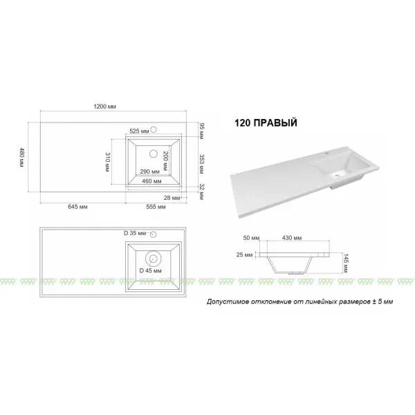 При производстве изделий из литьевого мрамора допустимое отклонение линейных размеров -+ 5мм.