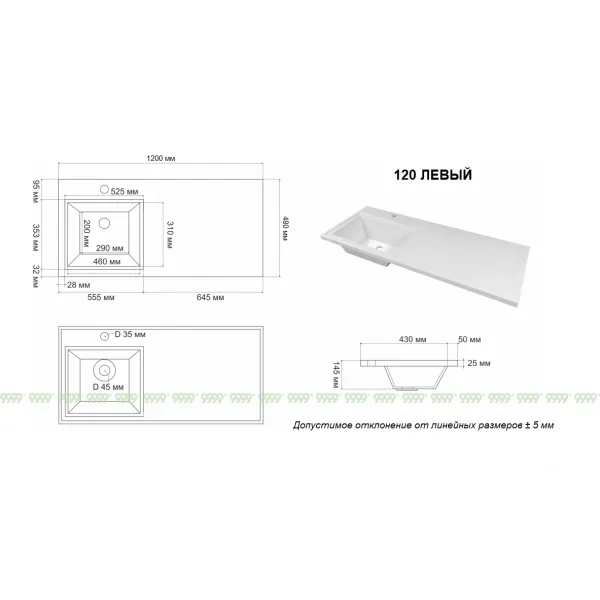 При производстве изделий из литьевого мрамора допустимое отклонение линейных размеров -+ 5мм.
