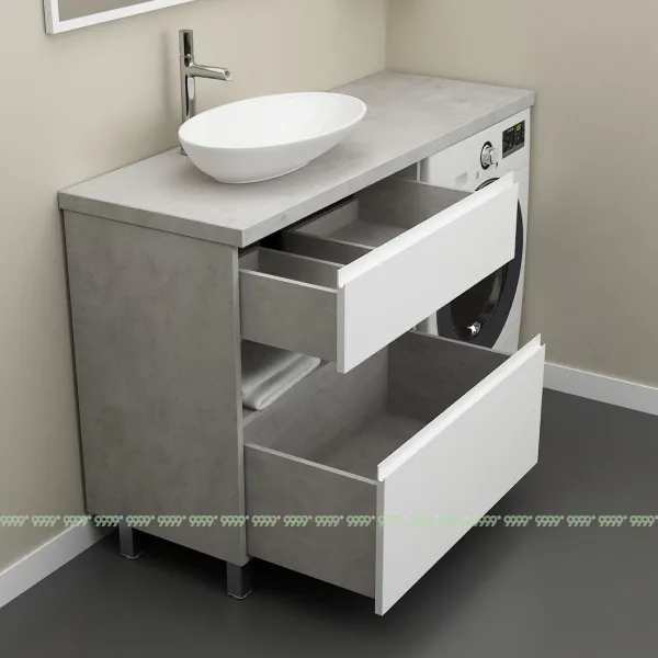 Функционал: напольная тумба, 2 выдвижных ящика с плавным ходом и закрыванием (доводчики нижнего монтажа : Boyard), открытая полка.
