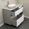 Снимите все выдвижные ящики из тумбы: во-первых, для безопасности, чтобы случайно их не повредить, а во-вторых, дать беспрепятственный доступ для монтажа к стене и к коммуникациям сзади для подключения смесителя и установки сифона. Прикрутите ножки в напольную тумбу.