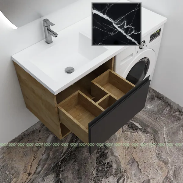 функционал: подвесная тумба, 2 выдвижных ящика с плавным ходом и закрыванием (доводчики нижнего монтажа - Boyard), две открытые полки..