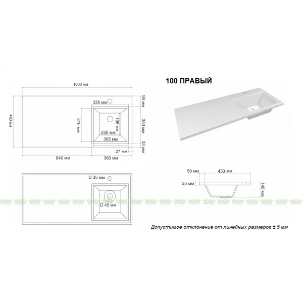 При производстве изделий из литьевого мрамора допустимое отклонение линейных размеров -+ 5мм.