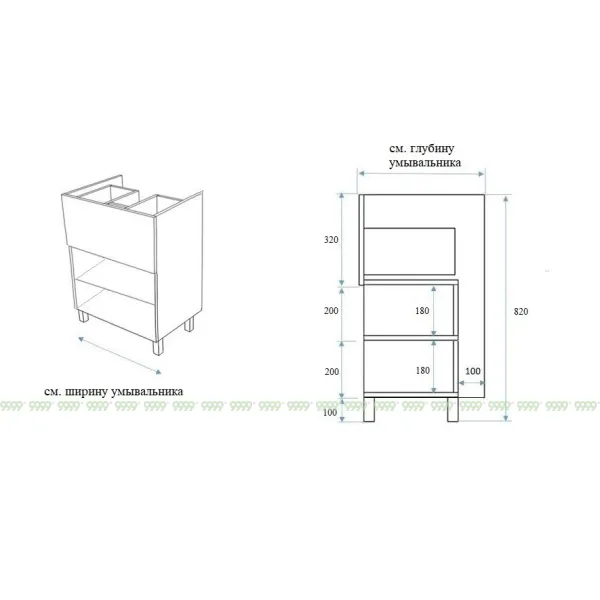 - ширина: 60 см (+/- корректировка под умывальник),