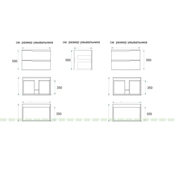Мебель для ванной: тумбы, пеналы, шкафчики и т.д поставляются в СОБРАННОМ ВИДЕ (кроме накладных ручек и ножек, если таковые есть в модели, они прикручиваются самостоятельно), столешницы под врезной или накладной умывальник изготавливаются БЕЗ ВЫРЕЗОВ под умывальник и смеситель (все вырезы производятся самостоятельно после монтажа столешницы на опоры (тумбу, кронштейны, уголки и т.д.) или оплачиваются дополнительно, но только после согласования)