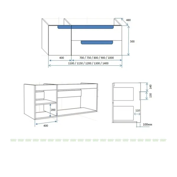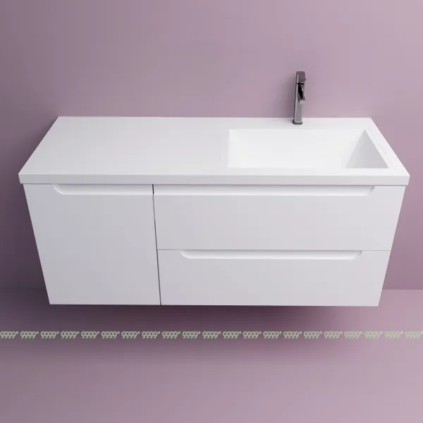 функционал: подвесная тумба, 2 выдвижных ящика, 1 дверца с плавным ходом и закрыванием (доводчики нижнего монтажа - Boyard), 1 полка.