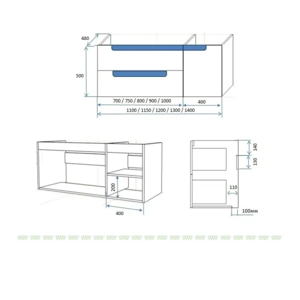 функционал: подвесная тумба, 2 выдвижных ящика, 1 дверца с плавным ходом и закрыванием (доводчики нижнего монтажа - Boyard), 1 полка.