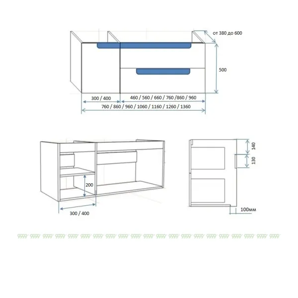 функционал: подвесная тумба, 2 выдвижных ящика и 1 дверца с плавным ходом и закрыванием (доводчики нижнего монтажа - Boyard), 1 полка.