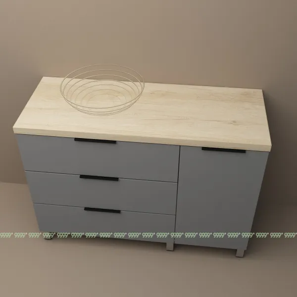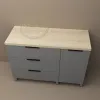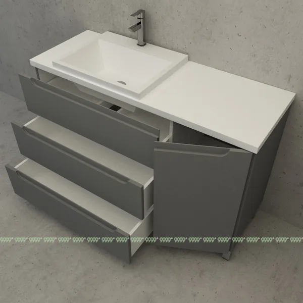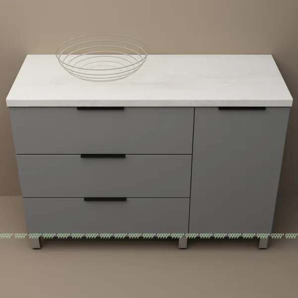 функционал: напольная тумба, 3 выдвижных ящика и 1 дверца с плавным ходом и закрыванием (доводчики нижнего монтажа - Boyard), 1 полка.