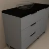 Снимите все выдвижные ящики из тумбы: во-первых, для безопасности, чтобы случайно их не повредить, а во-вторых, дать беспрепятственный доступ для монтажа к стене и к коммуникациям сзади для подключения смесителя и установки сифона. Прикрутите ножки в напольную тумбу.