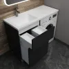 Снимите все выдвижные ящики из тумбы: во-первых, для безопасности, чтобы случайно их не повредить, а во-вторых, дать беспрепятственный доступ для монтажа к стене и к коммуникациям сзади для подключения смесителя и установки сифона. Прикрутите ножки в напольную тумбу.