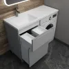 Снимите все выдвижные ящики из тумбы: во-первых, для безопасности, чтобы случайно их не повредить, а во-вторых, дать беспрепятственный доступ для монтажа к стене и к коммуникациям сзади для подключения смесителя и установки сифона. Прикрутите ножки в напольную тумбу.