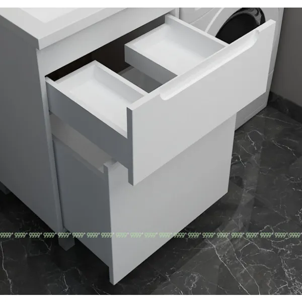 функционал: напольная тумба с регулируемыми ножками, 2 выдвижных ящика с плавным ходом и закрыванием (доводчики нижнего монтажа - Boyard), нижний ящик можно использовать как корзина для белья.