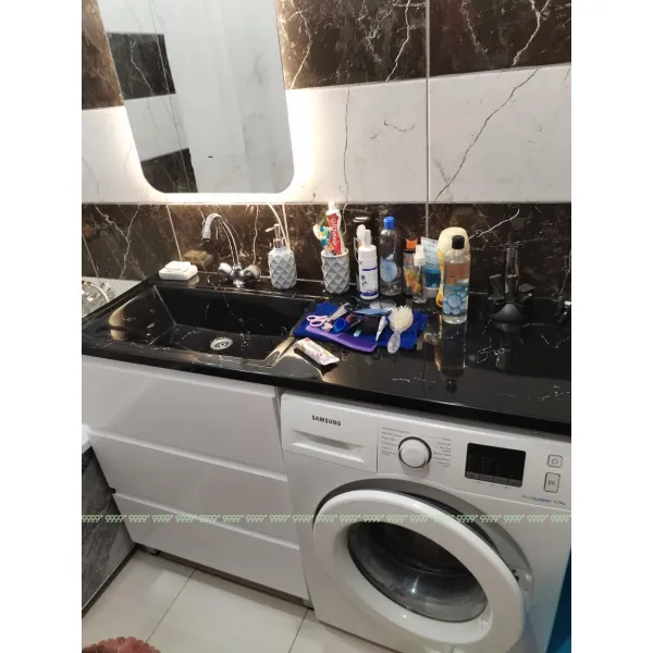 Раковина-столешница для установки на стиральную машину – это практично и удобно, минимум мебели в небольшой ванной комнате и больше свободного места для проведения необходимых гигиенических процедур. Помещенные на ее поверхность предметы не будут падать во время отжима стиральной машины.