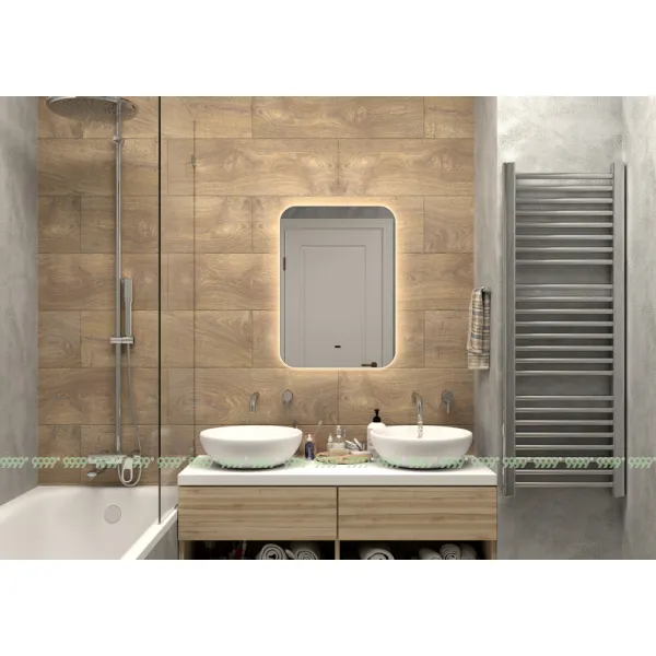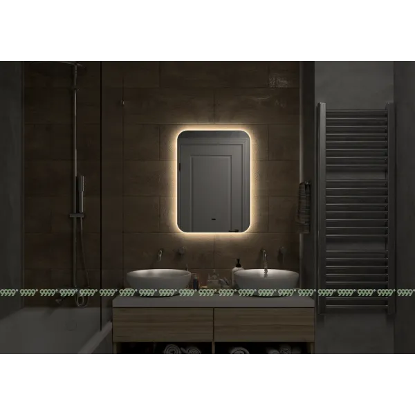 В качестве элемента LED-подсветки используется светодиодная лента с плотностью диодов 120 шт./м мощностью 9,6Вт/м. Это создает мягкое и равномерное свечение по периметру всего зеркала. Электрические компоненты размещены внутри корпуса, край полотна обработан еврокромкой, что обеспечивает надежную защиту от случайных порезов при контакте с изделием. Управление подсветкой осуществляется при помощи бесконтактного сенсора.