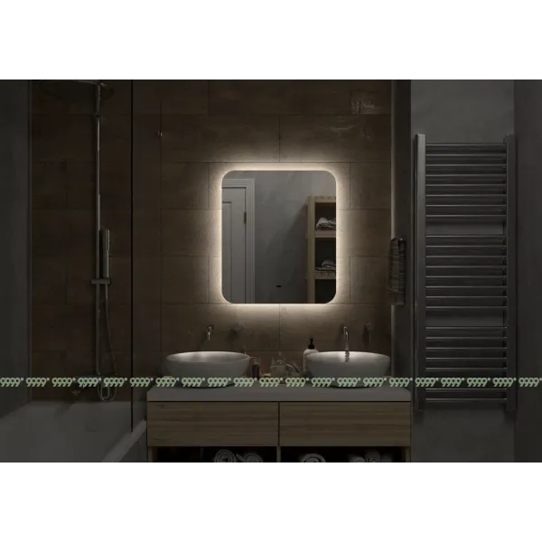 В качестве элемента LED-подсветки используется светодиодная лента с плотностью диодов 120 шт./м мощностью 9,6Вт/м. Это создает мягкое и равномерное свечение по периметру всего зеркала. Электрические компоненты размещены внутри корпуса, край полотна обработан еврокромкой, что обеспечивает надежную защиту от случайных порезов при контакте с изделием. Управление подсветкой осуществляется при помощи бесконтактного сенсора.