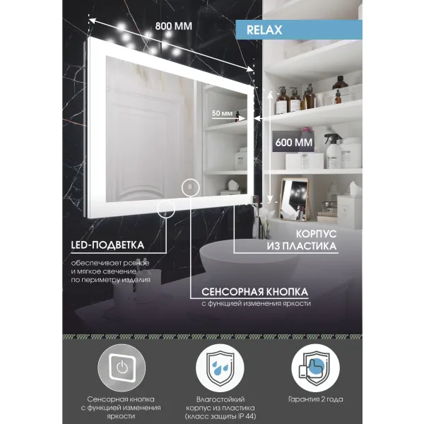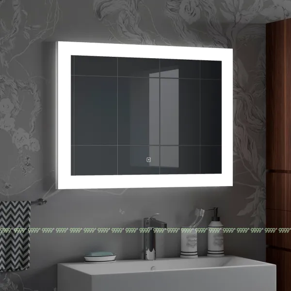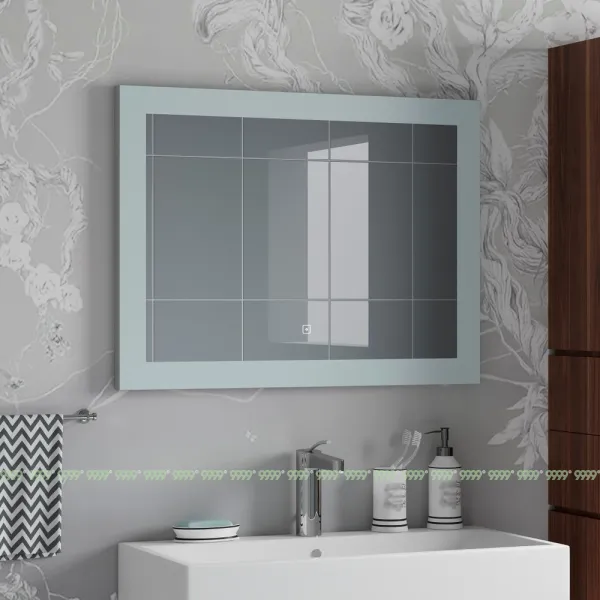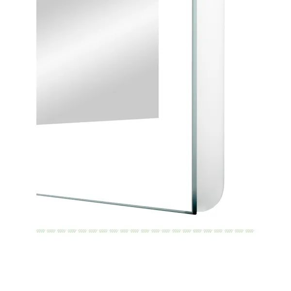 В качестве элемента LED-подсветки используется светодиодная лента с плотностью диодов 120 шт./м мощностью 9,6Вт/м. Это создает мягкое и равномерное свечение по периметру всего зеркала. Электрические компоненты размещены внутри корпуса, край полотна обработан еврокромкой, что обеспечивает надежную защиту от случайных порезов при контакте с изделием. Управление подсветкой осуществляется при помощи сенсорной кнопки, вынесенной на лицевую панель для удобства настройки необходимой яркости.