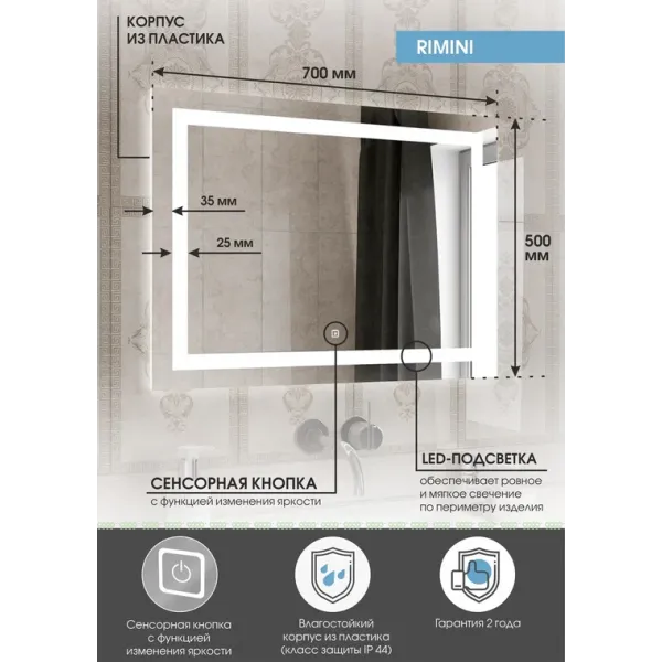 Яркость подсветки регулируется с помощью сенсорной кнопки, удобно расположенной в нижней части зеркала.