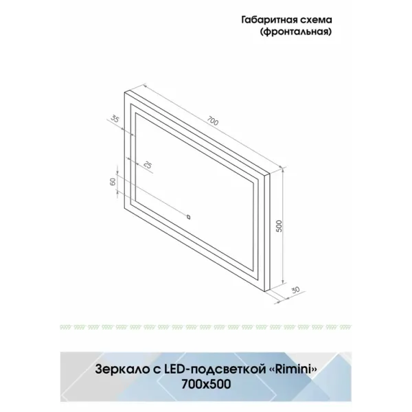 При изготовлении модели используется светодиодная лента с плотностью диодов 120 шт./м и мощностью 9,6Вт/м, что создает мягкое и равномерное свечение по периметру зеркала.