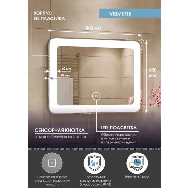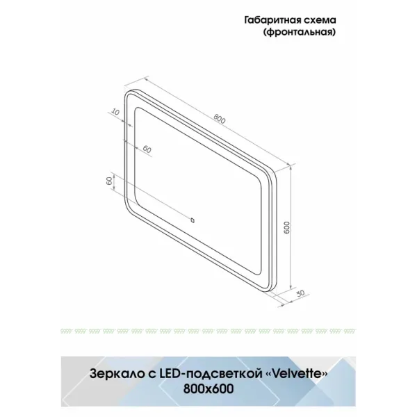 Модель обладает современным дизайном и удобным сенсорным управлением яркостью подсветки, расположенным в нижней части зеркала.
